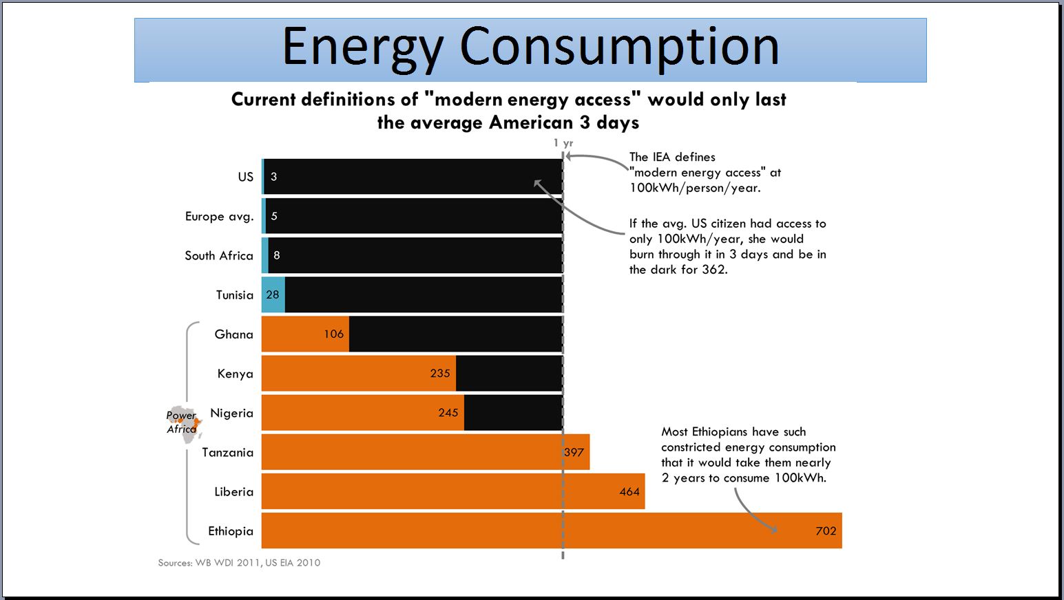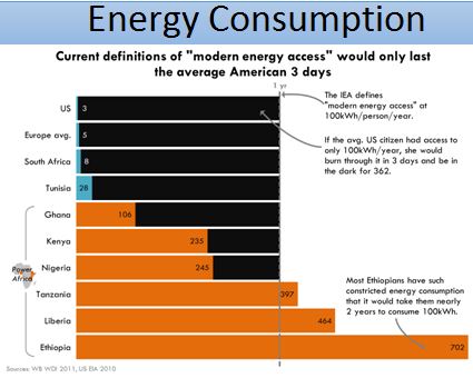 Now, there are some other issues I want to address. One of the big deficits of course in Africa, is the energy consumption. And as I said not everybody has that; the average international level of energy consumption is about 2,800 [kw?] but that's not equal. The only two countries which are exception are South Africa and Libya, before that. So the energy needs in Africa are enormous! I mean Africa has a lot of wealth, but also the hydropower potential which has never been built. But the attitude of the Western countries, like the Obama administration, they have something called "Power Africa Initiative," that certain nations in Africa will get energy provided. But they're not talking about hydropower, they're not talking about nuclear power, they're not talking about coal or gas or so on. They're talking about so-called "renewable" or "sustainable energy." And the International Energy Agency has a criteria for access to energy, which is a modern access to energy is about 100kw-hours per year per person. And this diagram shows very ironically, that that amount will be consumed by an American in three days! But they expect Africans to live with that for a whole year! Here's just one more ironical idea: My refrigerator can consume many times as much as an Ethiopian individual.