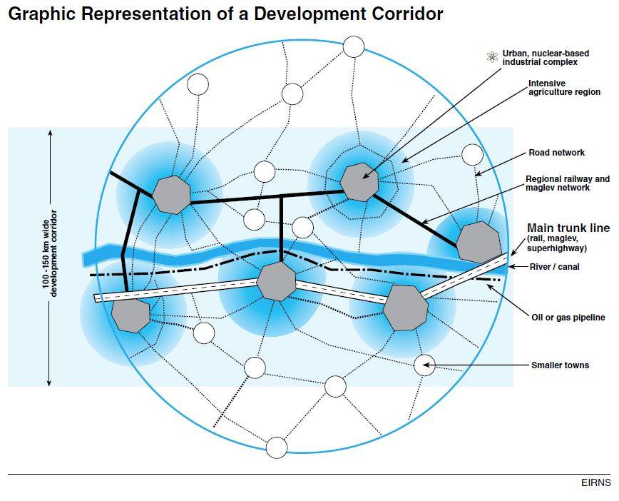 Now, the idea with all these lines is not only about trade. We want to warn people, that we are not talking about moving goods from China to Europe. That's not our concept. That's a byproduct. What we mean by the New Silk Road, the World Land-Bridge, that we need to create development corridors: a development corridor where you bring power, water, and technology to areas that are landlocked, that are far from industrial zones, and, explore the resources, human and natural resources of that region, to develop new centers of economic activity. Like landlocked nations, like in Central Asia, or the Great Lakes region in Africa. That's the concept. It's not about trade, although trade is an important aspect of this.