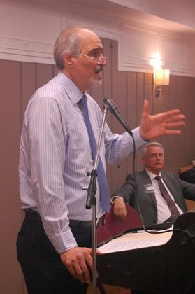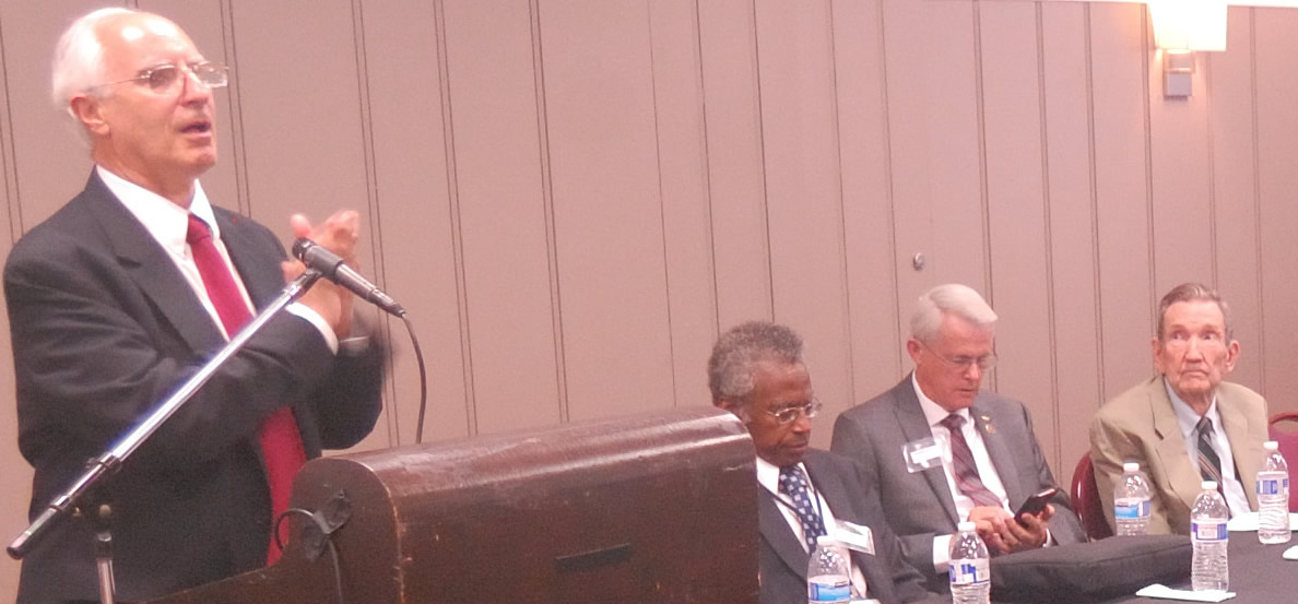 Jeff Steinberg at the podium. Seated, left to right: Dennis Speed, Richard Black, Ramsey Clark. |