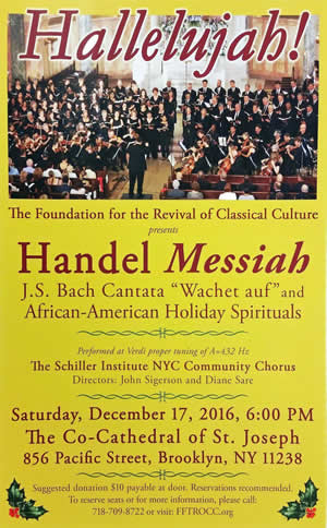 The Schiller Institute New York Community Chorus is proud to announce its participation in "A Holiday Concert for Unity," to be held at the Co-Cathedral of St. Joseph in Brooklyn on Saturday, December 17 at 6:00 PM. The concert is sponsored by the Foundation for the Revival of Classical Culture. The program will consist of the "Christmas" section of Handel's great oratorio, Messiah, the "Wachet Auf" cantata by Johann Sebastian Bach, and African-American Christmas Spirituals.