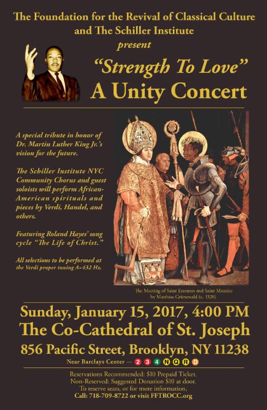 Join us as we attempt to recapture the real intent of The Martin Luther King Holiday -- public service through public action. On Sunday, January 15th, the Foundation for the Revival of Classical Culture will present a concert entitled "The Strength to Love -- A Unity Concert". It will take place at the beautiful Co-Cathedral of St. Joseph, 856 Pacific St., Brooklyn, NY at 4 pm on the Martin Luther King Holiday weekend.
