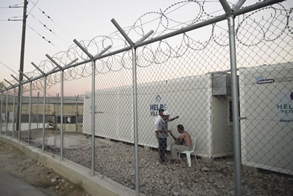 Inhabitants of Suda refugee camp in the Greek island of Chios on the Aegean Sea, seen through a barbed wire fence surrounding the camp, Sept. 29, 2016. |