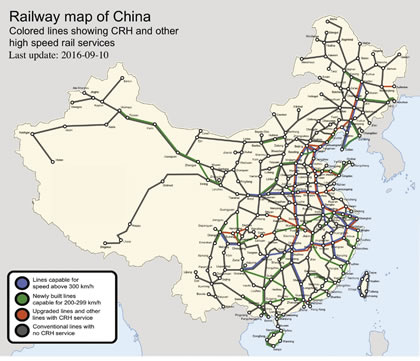 Map showing China rail network, including China High-speed Rail CRH (CRH), other high-speed rail, and conventional rail. |