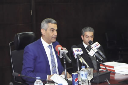 Egyptian Transport Minister, Dr. Saad El Geyoushi (left) presenting the Arabic version of EIR’s World Land-Bridge Report in March 2016 in Egypt. EIR Arabic editor Hussein Askary is on the right. |