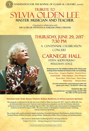 Celebrate the Beauty and Truth of Classical music with Simon Estes, Elvira Green, Kevin Short, Osceola Davis, and other Metropolitan Opera performers in their celebration of the life and times of Ms. Sylvia Olden Lee, one of the great American educators of the twentieth century. Born in 1917, Sylvia, who died in 2004, is being celebrated for her dedication to the forgotten children and young men and women of America, who were and are deprived of any knowledge of one of the greatest gifts of the human spirit--great Classical art in the form of music. The Office of the Mayor of the City of New York will present a declaration designating Thursday, June 29th, "Sylvia Olden Lee Day" throughout the city. The question we want people to ask is: "Why? Why is this woman important?" Here are two answers to the question, "Who Is Sylvia?"