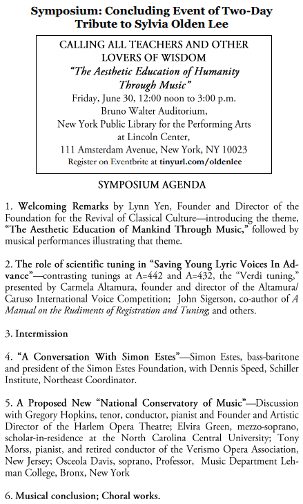 On Friday, June 30, 2017, at the Bruno Walter Auditorium of the New York Library for the Performing Arts, near Lincoln Center, a historic gathering of great musicians and associates of Sylvia Olden Lee, from different generations, backgrounds and accomplishment took place to discuss “The Aesthetic Education of Humanity Through Music.” The symposium was the second event of a two day “Tribute to Sylvia Olden Lee, Master Musician and Teacher,” sponsored by the Foundation for the Revival of Classical Culture, the Schiller Institute and the Harlem Opera Theater.
