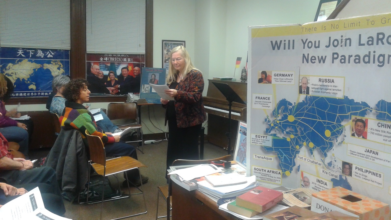 Next Jen Pearl presented a review of the history of the Schiller Institute’s 34-year campaign for a Just New World Economic Order, and to revive Classical culture. She presented a very clear Feinbild, as to who would actually be opposed to these ideas, quoting the evil Bertrand Russell on the usefulness of methods of menticide, to “instill the “unshakeable conviction that snow is black.” She described the degenerate paradigm shift that was created by Russell and his ilk after the death of Franklin Roosevelt through to the assassinations of the Kennedys and Martin Luther King Jr., to prevent the emergence of a such a just world order, employing such operations as the CIA-sponsored Congress of Cultural Freedom, which attacked anyone who represented a principle of truth, classical beauty, actual creativity, as an “authoritarian personality,” and which has manufactured a culture where truth is replaced by “the narrative” and “political correctness.”