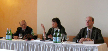 Helga Zepp-LaRouche, (center), Lyndon LaRouche, (left), and Frank Hahn at the March 2, 2006 EIR Berlin Seminar. |