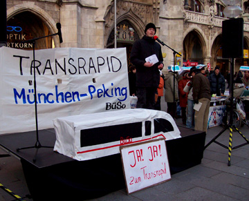 Dear guests and members of the BüSothose, who are not yet members, will perhaps later this evening become soit is really very good when there is so much interest in a topic that the room is overflowing, because of course at the moment, the question of whether the Transrapid will be built in Munich, yes or no, is really a topic which causes a stir. And when you organize on the street for it as we do, you of course find out that people have really different conceptions. Some people say, I am for the Transrapid, but only if it is a long route, not on such a short route as from downtown Munich to the airport. Others say, That is much too expensive! We have posters that say, Transrapid Munich-Beijing. But people still ask, Are you for it or against it?which should be clear.