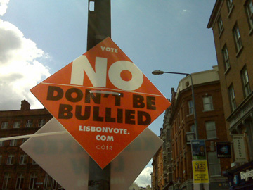 ![]() EIRNS/John Morton Ireland’s unequivocal “No” to the Lisbon Treaty signals a death-blow to the attempt by the Anglo-Dutch oligarchy to force the nations of Europe to submit to a one world dictatorship. Above: sign in Ireland prior to referendum. |