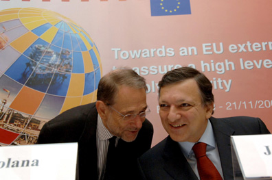 ![]() European Community/Christian Lambiotte EU foreign policy spokesman Javier Solana’s new paper forcasts conflict over stategic raw materials in the Arctic, as a result of “climate change.” The Russian press responded with fury, pointing to the militarization of the EU. Here, Solana (left), with Spain’s José Manuel Barrose, at a 2006 conference on “Europe’s Chanllenges in a Globalized World.” |