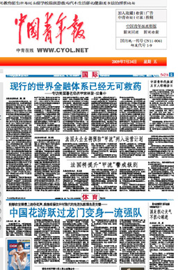 July 28China Youth Daily, the second-most widely read newspaper in China, reaching an audience of some 10 million people, ran a lead article July 24, on Lyndon LaRouche and his solution to the world economic crisis. Entitled, The Present International Financial System Cannot Be Saved, the article was the second in a series of interviews that are being conducted by the paper, with U.S. economic and China experts, who are asked to give their views on the U.S.-China relationship, as the Obama Administration goes into its first round of meetings in an enhanced Strategic Dialogue and Strategic Economic Dialogue mechanism.