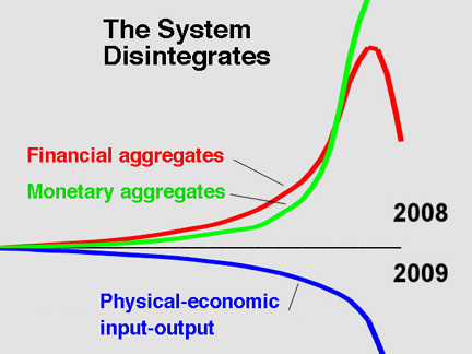 Here we have a graphic [Figure 2] that LaRouche put out in 1995 for the first time, and which is being studied closely by important economists in the United States. The lower curve, the output of the real economy, has been going down for a long time, worldwide, and not just since the financial crisis broke out. And since July 2007, it has been going down hyperbolically. This curve shows agricultural and industrial production, and basically everything thats needed for the population. There has been a collapse of 50%, or more in some categories.