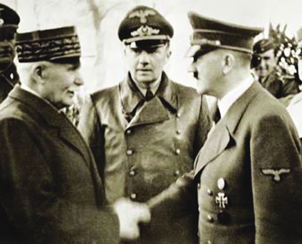 | French Marshal Philippe Pétain greets Adolf Hitler. The French made a deal with the Nazis, allowing the Wehrmacht to march into France. The British, who had expected Hitler to move East, screamed, “We were double-crossed!” and begged the U.S. for help. | German Federal Archive Col. Claus Schenk von Graf Stauffenberg (left) with Hitler, five days before the July 20, 1944 attempt by Stauffenberg and others to assassinate the Führer. They had made contact with the Allies about a peace settlement, but were betrayed by the British. On the right is Field Marshal Wilhelm Keitel, who played a key role in foiling the plot. |