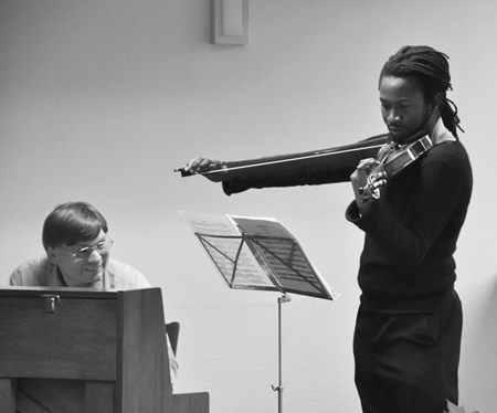 By concentrating on great art, on discoveries, on man’s creativity, Zepp- LaRouche stressed, one’s passion and one’s duty become inseparable. Here, Werner Hartmann (piano) and Kwame Cole (violin) play Brahms’ Op. 77, violin concerto in D major, at the Berlin conference.