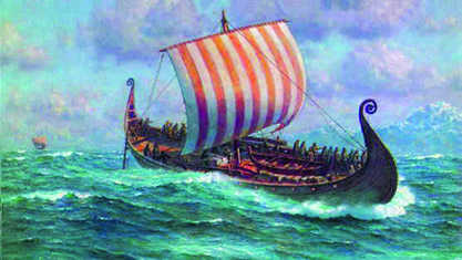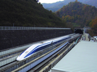 | Human transportation has advanced from less effective modes, including ocean and riparian transport, to the evolutionary development of railway transport, and now, to magnetic levitation modes. Shown: a Viking ship (8th-11th centuries); and the MLX01, a modern maglev, at Yamanashi test track in Japan. | |