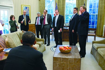 The principal threat to civilization, at this moment, writes LaRouche, is from the conditions brought about by the Nov. 2 election: the combination of Nerobama and the newly elected pro-fascist Republicans. Here, Obama (back to camera), with his White House team, in the Oval Office, the day after the election. |