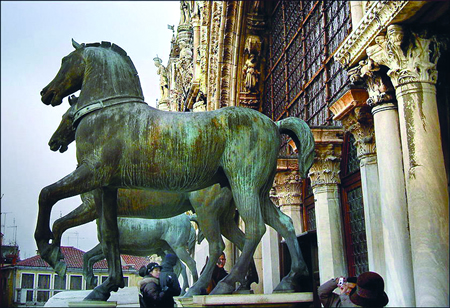 Creative Commons/Ricardo André Frantz European history, including its trans-Atlantic extension, has been chiefly divided among three successive types of maritime, monetarist rule: Ancient (represental by the Roman Empire, top left), Medieval (Venice: the Horses of St. Mark were looted from Constantinople during the Fourth Crusade) and Modern (the British Empire: in 1805, the British Navy won a decisive victory in the Battle of Trafalgar, establishing its supremacy on the seas). |