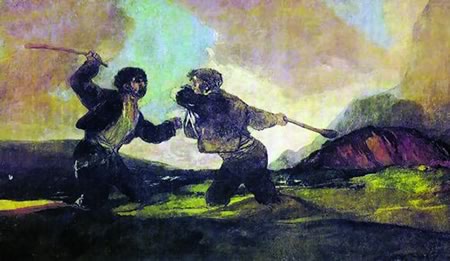 Each against all. “Duel with Cudgels” (detail), oil. |