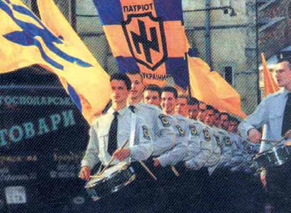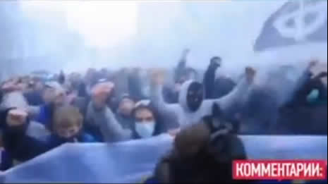 Watch the video (presented by Natalia Vitrenko in her webcast)[1]These are "peaceful demonstrators" against the government of Ukraine. The flag in the upper right corner is a symbol of white supremacy (see stormfront.org) |