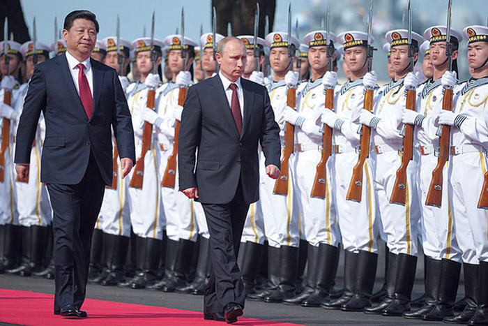 Presidents Xi Jinping and Vladimir Putin at the opening ceremony of the Russia-China Naval Interaction joint exercises, May 2014, in Shanghai. The official People’s Daily published an article warning that China needs to be prepared, since “it is not impossible that a world war could break out.” |