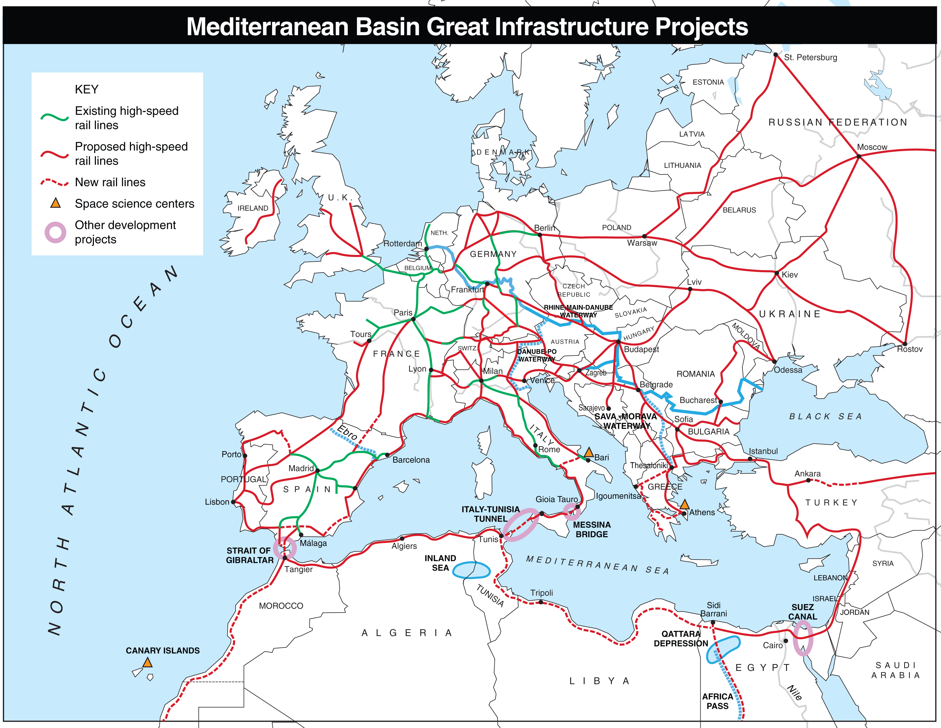 This is the European extension of the Eurasian Land-Bridge (Figure 8), a part of the World Land-Bridge, which we produced in 2012, when it became clear that the policy of the Troika transformed all of Southern EuropeGreece, Italy, Spain, Portugalinto economic desert zones, reducing the real economy of Greece, for example, by one-third, causing two-thirds unemployment of the youth, increasing the death rate, increasing the suicide rate. The same picture for Italy and Spain and Portugal. And it was the idea to extend the New Silk Road/Eurasian Land-Bridge into Spain, into the Balkans, and then from there, to build bridges and tunnels into Africa, and connect it with the extension of the New Silk Road into Africa.