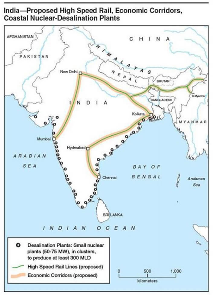 Prime Minister Modi has revived all of this, and he has created a task force on the interlinking of these rivers. He announced plans to convert 101 rivers into transport channels, which will cut transport costs by 30%, and increase the capacity gigantically. That goes together with several desalination plants on the coast of Tamil Nadu, and it also involves a plan to connect 14 rivers from the Himalayas to 16 others across the Indian peninsula, adding 35 million hectares of irrigated land, and 34,000 megawatts of electricity. That is three times as much as you need to provide electricity for New York City.