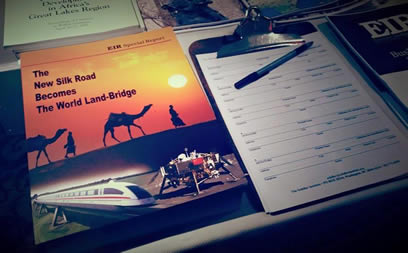 Now, the World Land-Bridge: This proposal, which we have produced in a study of over a year’s duration, and which we published at the end of last year. This is a 370-page study, which not only outlines all the future projects, the tunnels, bridges, corridors, etc., which are needed to turn the present world situation into a coherent connected World Land-Bridge; it also has a lot of the scientific conceptions provided by the scientific method of Mr. LaRouche, of physical economy, of why an increase in the energy-flux density in the production process, is the absolutely necessary way to go; and why only with these principles, can you provide food and livelihood for the increased population in the world, and the increase in the relative population density is the law of the universe. And all of that you will find in this report.