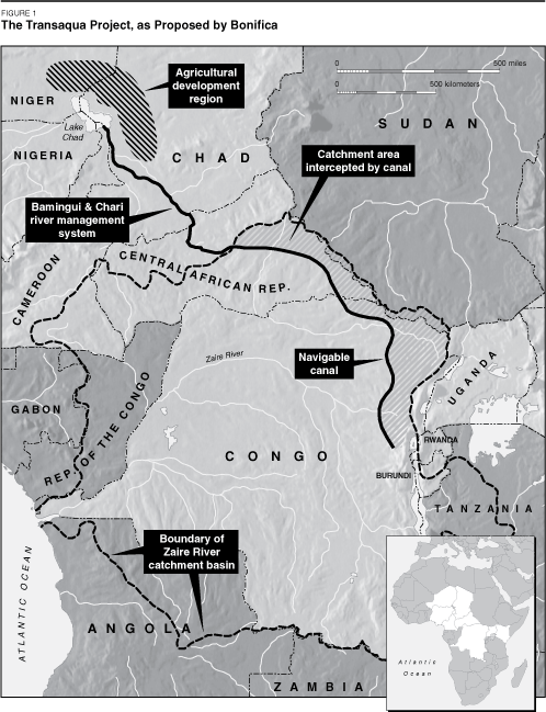 This approach must be taken to Lake Chad, which has shrunk to less than 10% of its previous levels, and for which we have proposed for a very long time, the Transaqua plan (Figure 5), which has been worked out by the Italian physicist Dr. [Marcello] Vichi, which has the idea of taking the abundant wateractually, too much waterfrom the Congo River, and bringing it up through a system of channels and canals into Lake Chad, which would transform the life of millions of people. Obviously, this is not an option, but a bitter necessity.