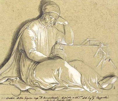 Brunelleschi depicted holding a model of the dome of the Florence cathedral, by Italian painter Giuseppe Bezzouli (1784-1855). |