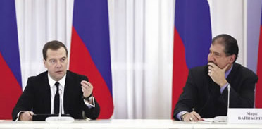 Russian Prime Minister Dimitri Medvedev warned Feb. 12 that the deployment of ground troops into Syria by the U.S., NATO, Saudi Arabia, or Turkey would immediately lock in an escalation to world war. Medvedev is shown here in 2013 with Mark Weinberger, Global Chairman and CEO of Ernst & Young, one of the Big Four audit firms. |