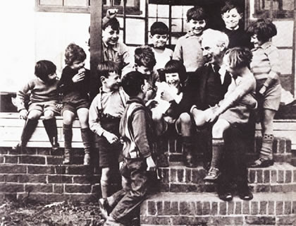 Bertrand Russell here smiles upon victims attending his experimental school, Beacon Hill, founded in 1927. |