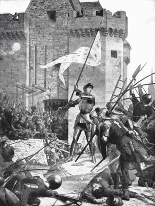 Jeanne d’Arc, France’s murdered hero figure, shown here in battle. Her memory later became a great force in France. |