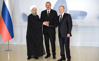 President Putin (right), Azerbaijan President Ilham Aliyev (center) and Iran President Hassan Rouhani (left), before the start of a trilateral meeting Aug. 8, 2016. |