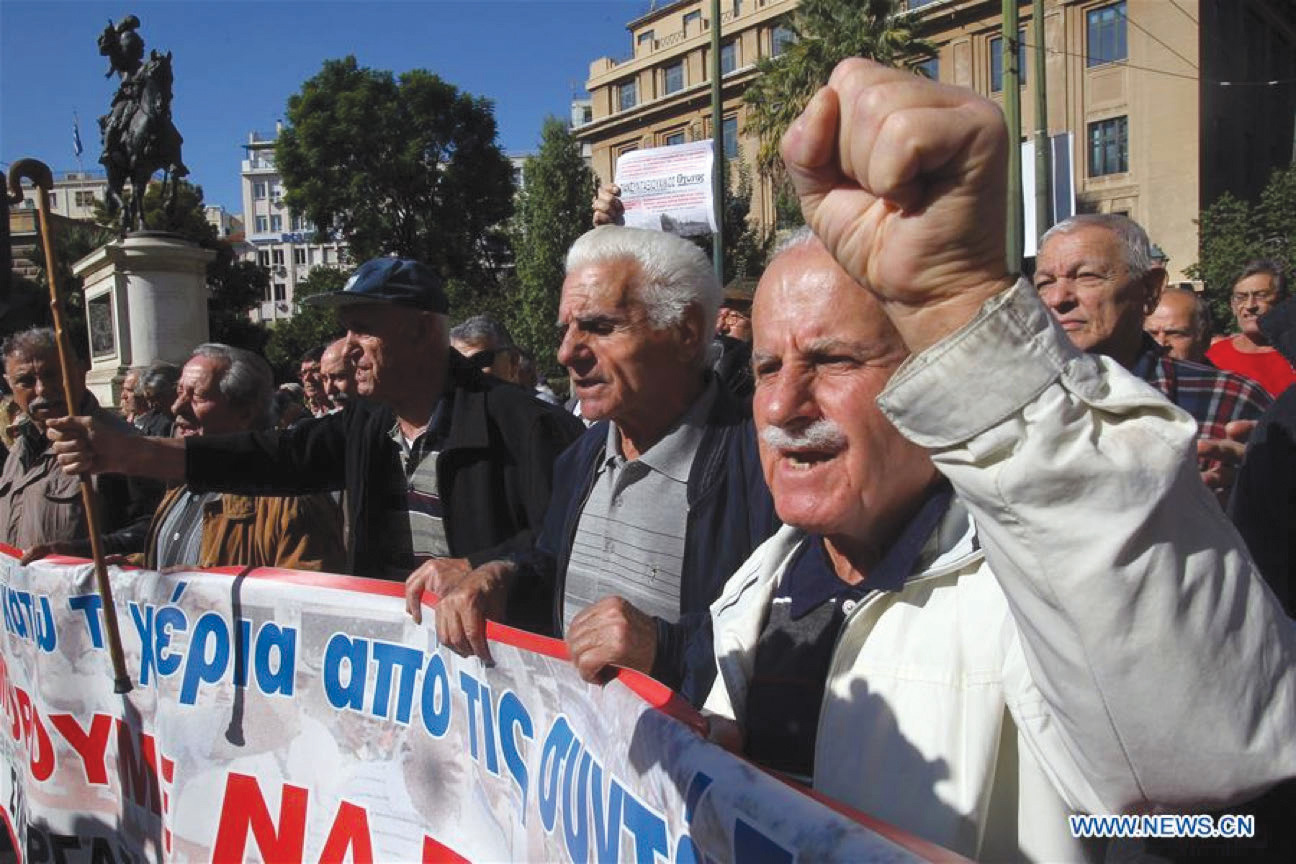 Thousands of Greek retirees rally in central Athens, against the fresh round of pension cuts implemented by the government under bailout agreements. |