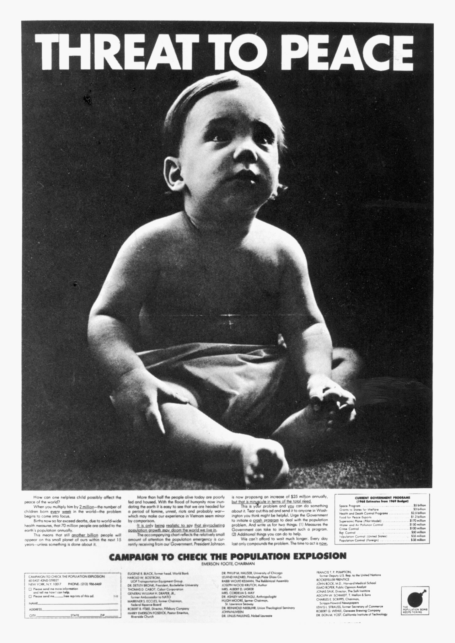 Neo-Malthusian propaganda in the 1960s (left) and the 1990s (right). H.G. Wells laid the foundations for this anti-human doctrine: “In a world where pressure on the means of subsistence was a normal condition of life, it was necessary to compensate for the removal of traditional sexual restraints, and so my advocacy of simple and easy love-making had to be supplemented by an adhesion to the propaganda of the Neo-Malthusians.” |
