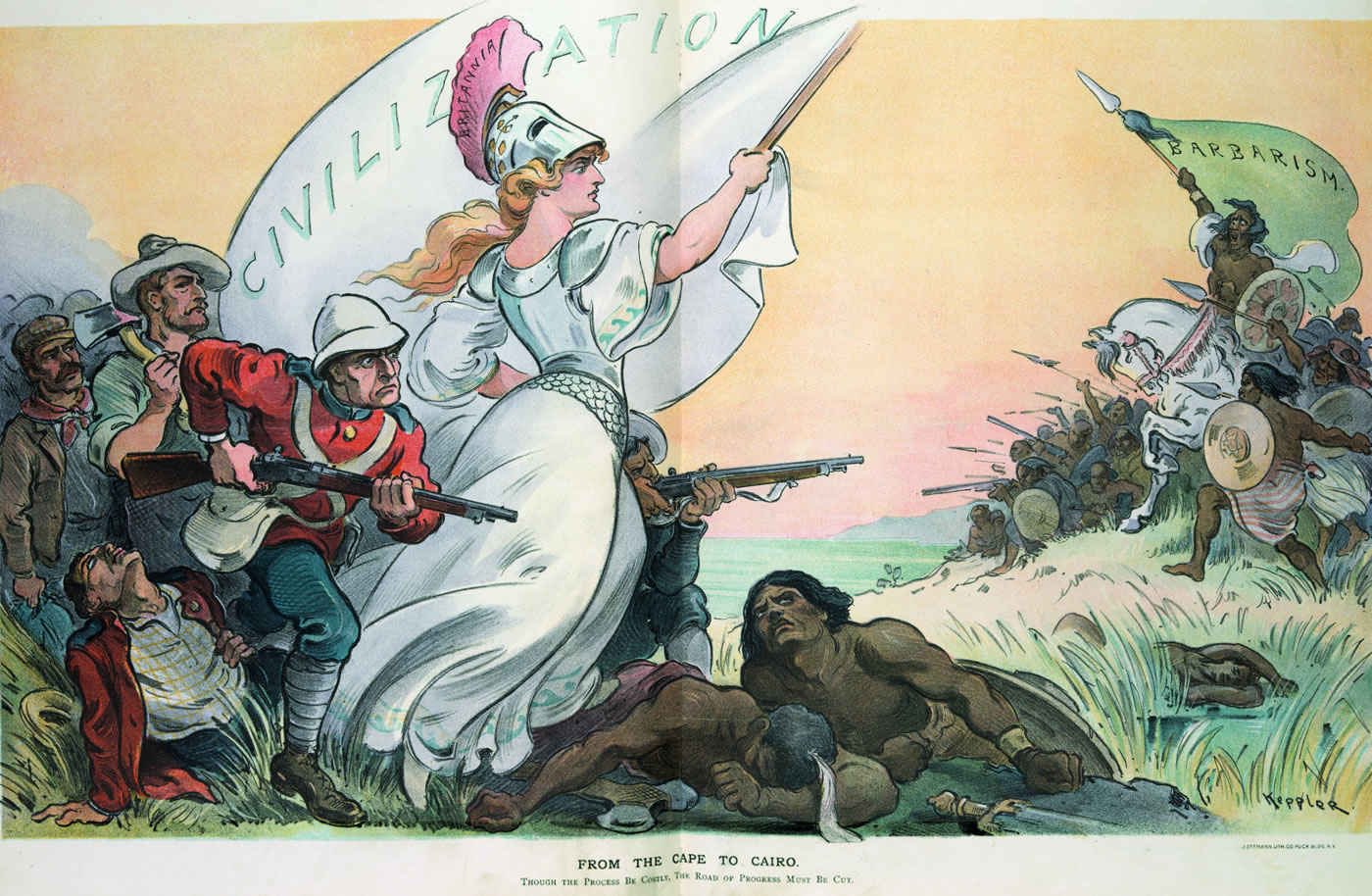 Britain is a maritime form of empire, LaRouche writes, an international dictatorship imposed upon a collection of otherwise, ostensibly separate nations, as seen in the post-Westphalian, euro system today. This 1902 Puck cartoon depicts “Britannia,” as “Civilization” crushing the “Barbarians.” |