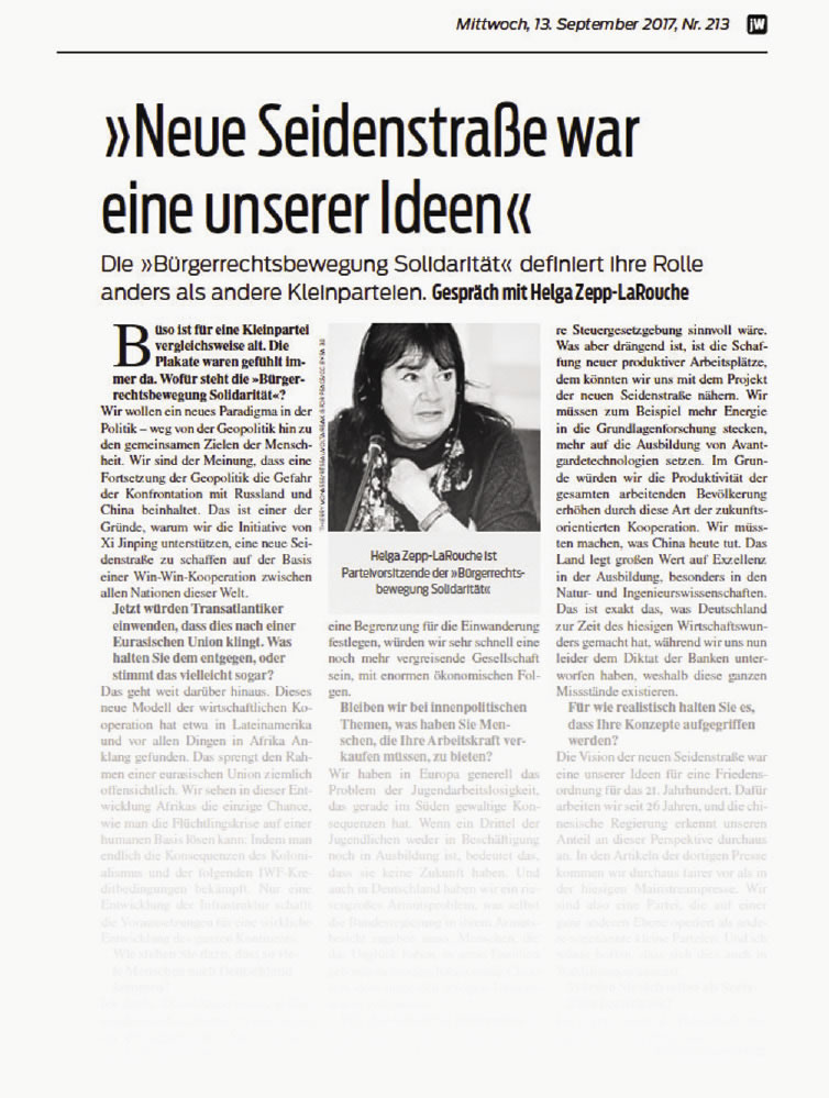 Sept. 13—Junge Welt (Young World), a German daily, published a brief interview with Helga Zepp-LaRouche, chairwoman of the German political party, Civil Rights Movement Solidarity (BüSo) on Sept. 13, under the provocative title, ‘The New Silk Road Was One of Our Ideas’—provocative in the current debate over China’s New Silk Road in the German Federal election campaign, in which Mrs. Zepp-LaRouche is leading a national slate of candidates. Junge Welt, published in Berlin, is a Marxist daily with a readership of 50,000. Without explanation, the interview was taken down from its website the next day.