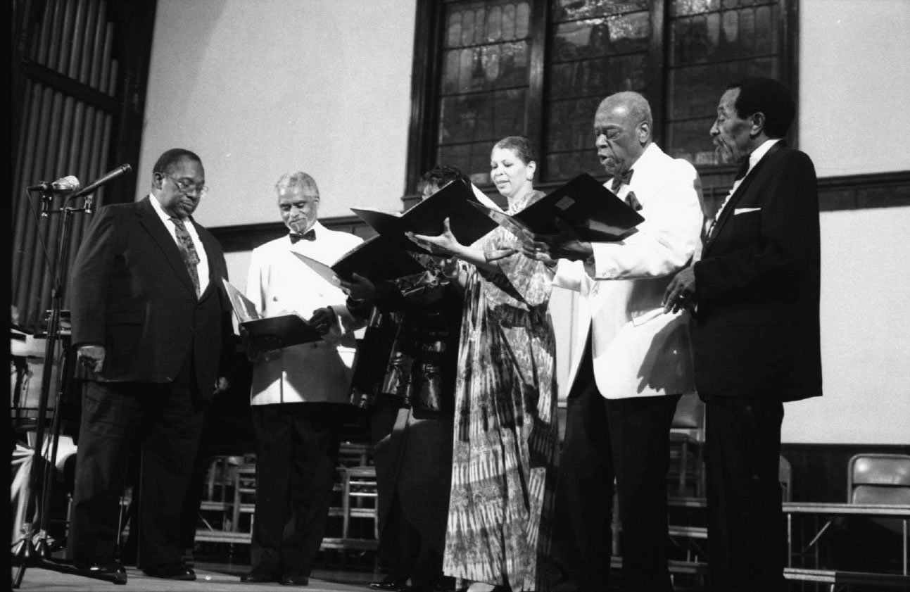 A sextet at the Schiller Institute’s May 1994 conference at the Howard University Rankin Memorial Chapel, for a Marian Anderson National Conservatory of Music Movement. From left to right: Rev. James Cokely, George Shirley, Detra Battle (largely hidden), Kebeme (Valerie Eichelberger), William Warfield, and Robert McFerrin. |