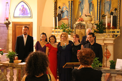 Left to right: Ishchenco Vsevolod (bass), Zhang Yi (soprano), Liu Ling (soprano), Natalia Margarit (soprano), Claudia Zucconi (pianist), Maestro Silvano Frontalini, Rino Matafù (tenor).