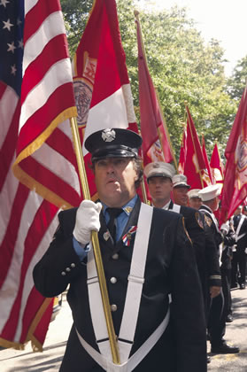 Prior to the Mass, members of the Battalion, which includes five engine companies and one ladder company in Brooklyn, marched from Ground Zero in Manhattan, over the Brooklyn Bridge, to St. Joseph’s Co-Cathedral, making stops at several firehouses along the way. They carried FDNY [New York Fire Department] flags, one for each of their fallen members. For the firefighters, the journey to Brooklyn served to symbolize the return home of their fallen comrades, said Firefighter Thomas Callahan, who delivered opening remarks at the church.