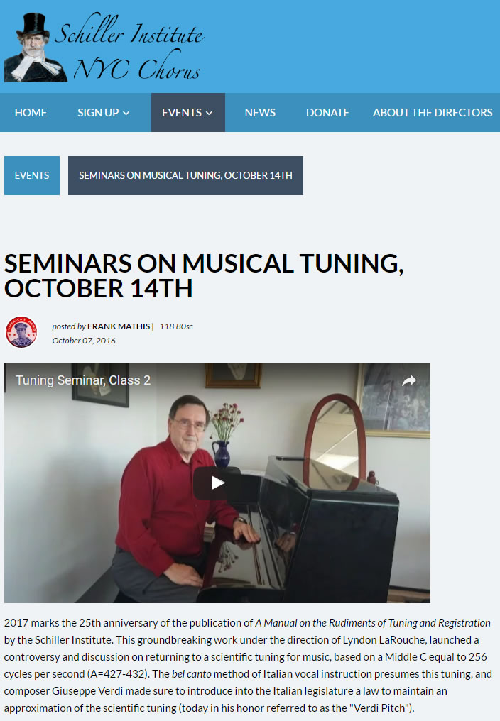 Schiller Institute Music Director John Sigerson will give the second lecture-demonstration on the universal principles of musical tuning, registration, voice placement, Classical beauty--principles which guide the Schiller Institute's "Manhattan Project" choral process.