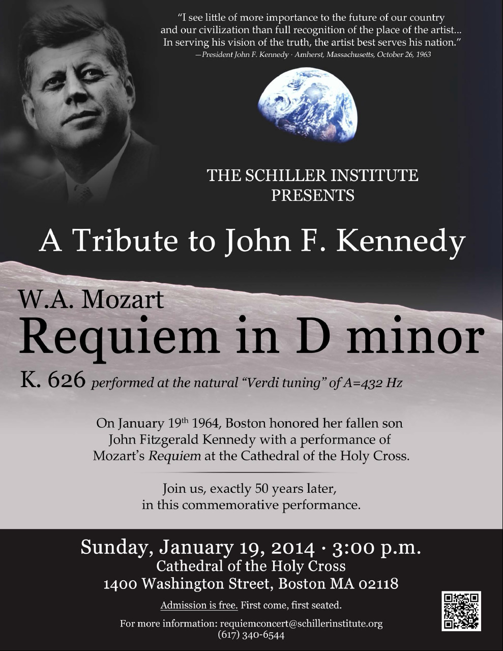 On Sunday, January 19, 1964 a performance was given of Mozart's Requiem Mass in Boston honoring the recently assassinated John F. Kennedy. The Mozart had been specifically requested by his widow, Jacqueline Kennedy. And on January 19, 2014 the Schiller Institute will present another performance of the Mozart Requiem in memory of president Kennedy--50 years later, to the day---at the Cathedral of the Holy Cross in Boston. This event will honor Kennedy's legacy of inspiration, especially in young people, of the patriotism and soaring idealism which produced the Apollo moon project and the Peace Corps and the entire climate of hope and confidence associated with Kennedy's Presidency.
