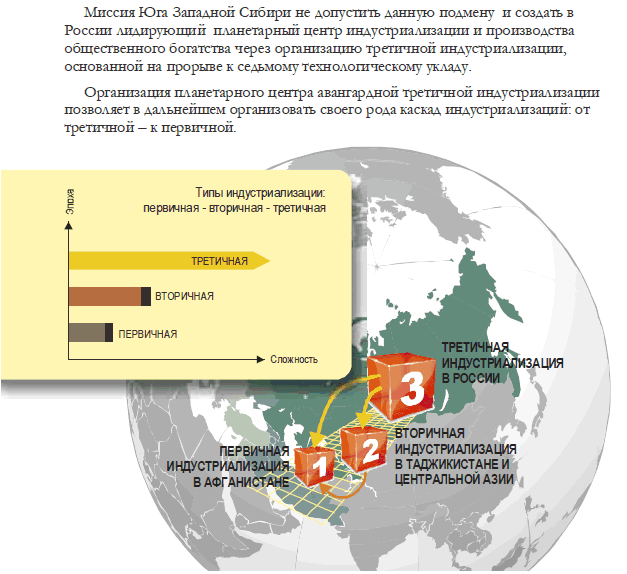 Siberia Can Become an Economic Center of the Planet,” issued by the Institute for Migration, Demography and Regional Development (Moscow), which presents the alternative development concept in detail. The schematic shows primary industrialization (1) for Afghanistan, secondary industrialization (2) for the nations of Central Asia, and tertiary industrial modernization (3) in Russia. The graph at the upper left compares these three levels, shown bottom to top, in terms of time or industrial epoch on the y axis and complexity on the x axis. The development zone envisioned here extends from the science-center cities of Siberia to the Persian Gulf, encompassing Iran as well as Afghanistan and Central Asia. |