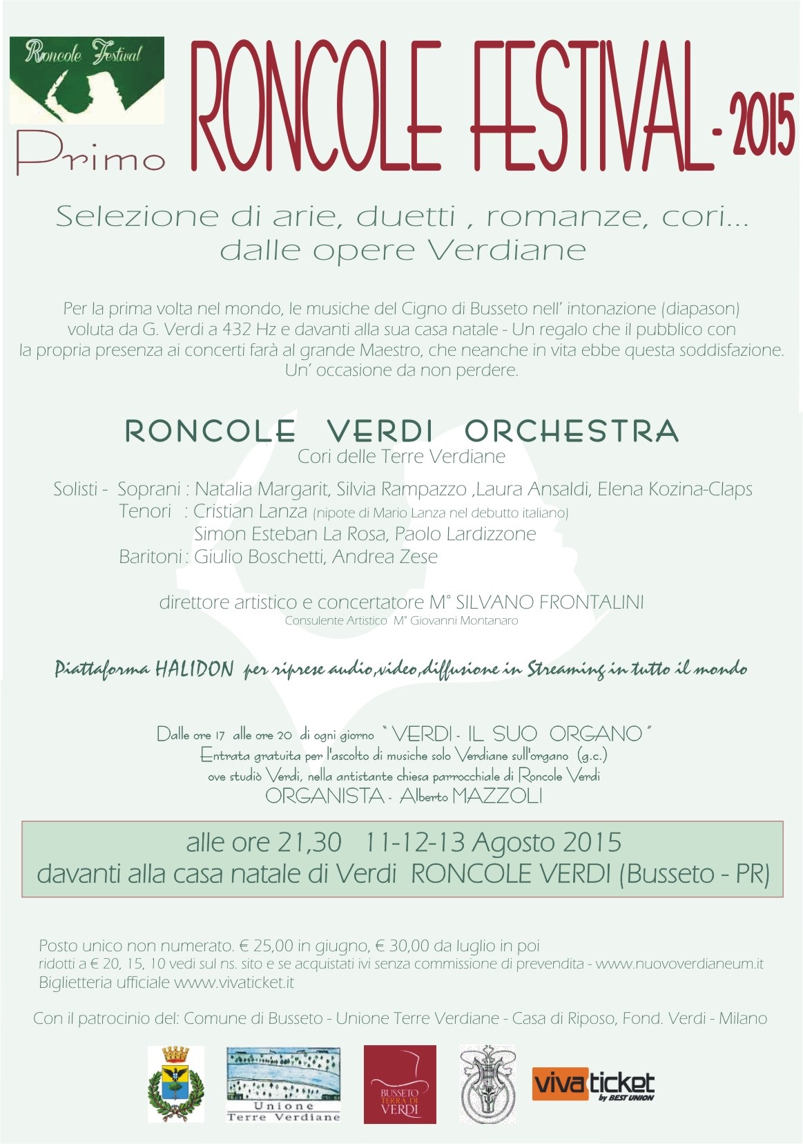 August 11th, 12th and 13th, 2015 will be an historic date for Verdi’s lovers all over the world: in front of Verdi’s home, in Roncole (near Busseto) conductor Silvano Frontalini, the City of Busseto and the Casa Verdi in Milan have organized the Primo Roncole Festival, with three concerts in the Verdi tuning (A=432 Hz) under the baton of Mo. Silvano Frontalini, who will conduct the Primo Roncole Orchestra. Among the Italian singers, there is also Cristian Lanza, nephew of the world famous tenor Mario Lanza. All singers, and the Coro delle Terre Verdiane, will perform arias, scenes and choruses from Verdi’s operas at A=432 Hz.