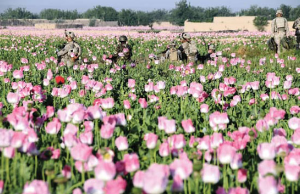 ISAF and Afghan troops on patrol in a poppy field in Zharay District, April 2011. |