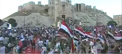 Supporters of the government of Syria in Aleppo. From the Schiller Institute video, "The Reconstruction of Aleppo", presented at the Schiller Institute Conference in Berlin, Germany, June 25-26, 2016. |
