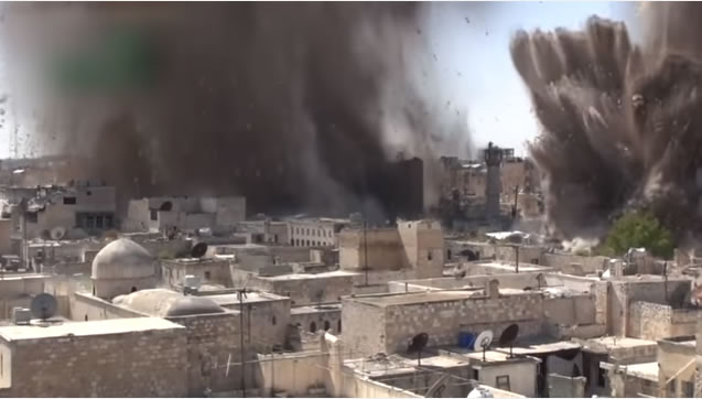 Bombing of a Syrian city by Islamic State, using weapons supplied by the U.S. and the U.K. through allies Saudi Arabia and Turkey, in its quest, wholeheartedly endorsed by U.S. President Barack Obama, to remove Syrian President Bashar Assad from office by force. From the Schiller Institute video, "The Reconstruction of Aleppo", presented at the Schiller Institute Conference in Berlin, Germany, June 25-26, 2016. |