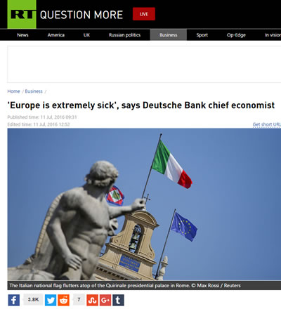 Reuters also gave extensive coverage to the Folkerts-Landau interview. Cityam, an online financial publication, noted that Italian banks are holding 360 billion euros of non-performing debt, with shares in all the major Italian banks and other Mediterranean banks—Unicredit, Banca Monte dei Paschi di Siena, Banco Popolare and Intesa San Paolo (Portugal)—down 25 percent since the vote for Brexit. Michael Hewson of CMC Markets UK was quoted, “If Italy goes under then it will take the rest of Europe with it.”
