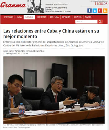 June 1, 2017 (EIRNS)—In an interview with the Cuban daily Granma, published May 31, [Now available in English] Zhu Quingqiao, head of the Latin American/Caribbean Affairs Department of China’s Foreign Ministry, emphasized the inclusive nature of the Belt and Road Initiative (BRI), which is open to all Ibero-American and Caribbean nations.